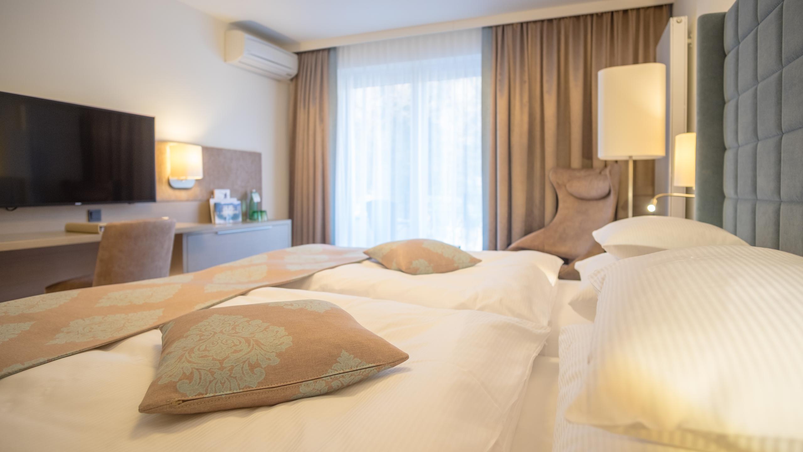 Das Doppelzimmer (ca. 28-30 m²) im neu gestalteten Parktrakt ist ausgestattet mit einem eleganten Holzboden in Eiche gebürstet und Design-Relax-Sessel, Minibar, Safe und Klimaanlage, Badezimmer mit Dusche/WC, Musikpaneel, Rainshower und Massagedüse, Waage und exklusiven Accessoires, Spa-Tasche mit Bademantel, Badetücher und Badeslipper, SAT-TV mit 49 Zoll-Flachbildschirm und über 100 Programmen, Sky und Radio, Telefon, Internetanschluss mit kostenlosem W-LAN und Balkon mit wunderschönen Blick zum Pool und Park.