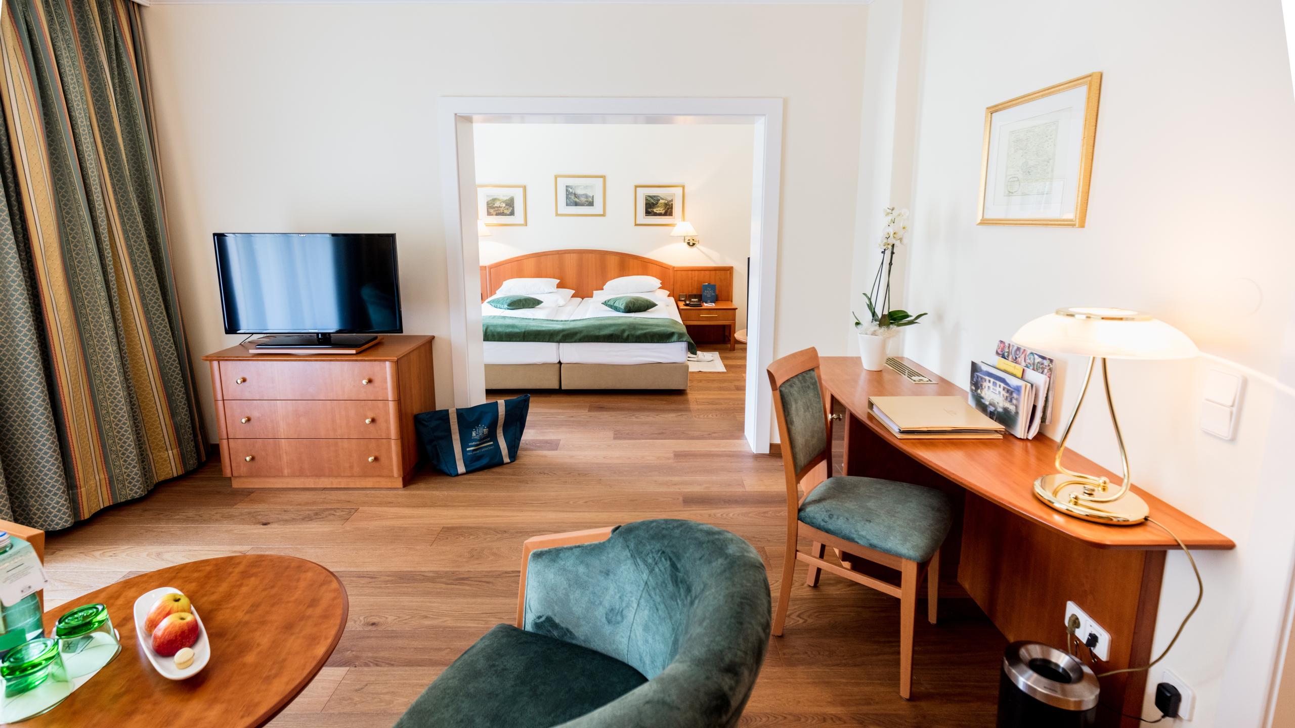Das Doppelzimmer (ca. 39-43 m²) im mittleren Hoteltrakt ist ausgestattet mit optisch getrennten Wohnraum und gemütlicher Wohnecke, Teppichboden (teilweise auch mit Holzboden), Minibar und Klimaanlage, Badezimmer mit Badewanne, separates WC, teilweise mit Bidet, Waage und exklusiven Accessoires, Spa-Tasche mit Bademantel, Badetücher und Badeslipper, SAT-TV mit 2 Flachbildschirmen und über 100 Programmen, Sky und Radio, Telefon, Internetanschluss mit kostenlosem W-LAN, Safe und Balkon mit Blick zur Therme und den Karawanken oder in den Park.