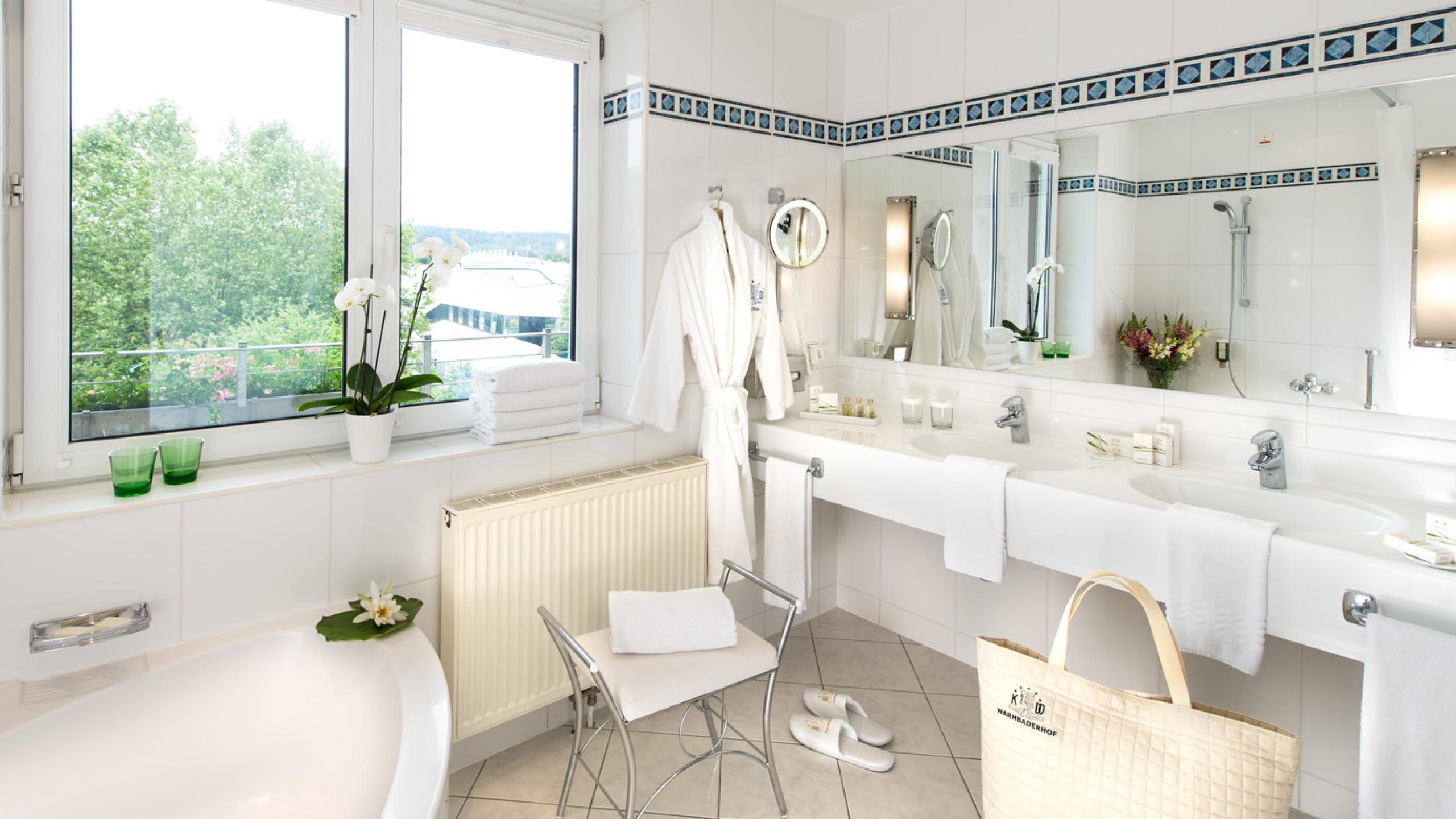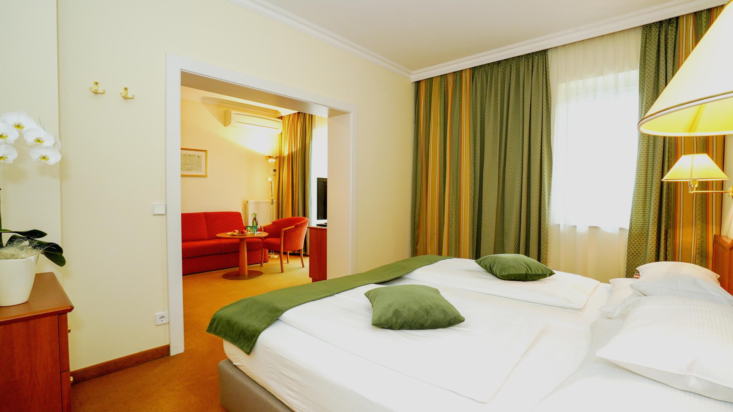 Das Doppelzimmer (ca. 33-36 m²) im mittleren Hoteltrakt ist ausgestattet mit gemütlicher Wohnecke, Teppichboden (teilweise auch mit Holzboden), Minibar und Klimaanlage, Badezimmer mit Badewanne oder Dusche, separates WC, teilweise mit Bidet, Waage und exklusiven Accessoires, Spa-Tasche mit Bademantel, Badetücher und Badeslipper, SAT-TV mit Flachbildschirm und über 100 Programmen, Sky und Radio, Telefon, Internetanschluss mit kostenlosem W-LAN, Safe und Balkon mit Blick zur Therme und den Karawanken oder in den Park.