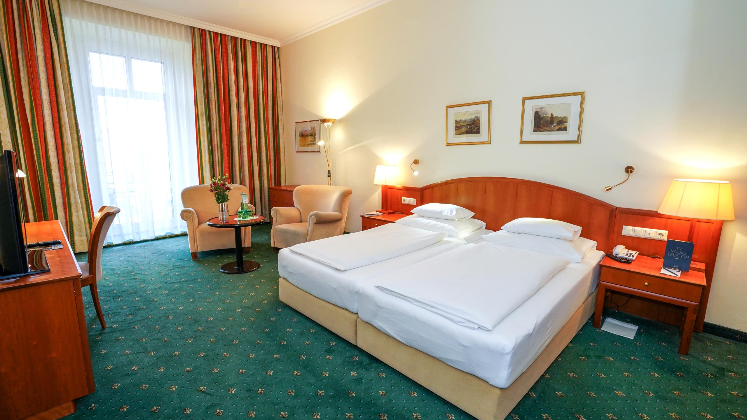 The double room (approx. 28-30 m²) in the Walterhof original building is equipped with a cosy sitting corner, a mini bar and air conditioning, a bathroom with a bath, a separate WC, bidet in selected rooms, scales and exclusive accessories, spa bag with bath robe, bath towels and bath slippers, flat screen SAT-TV with over 100 channels, Sky and radio, telephone, internet connection with free W-LAN, safe and balcony with a view of the thermal springs and the Karawanks.